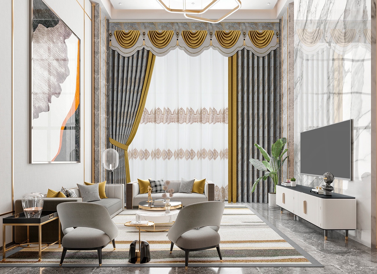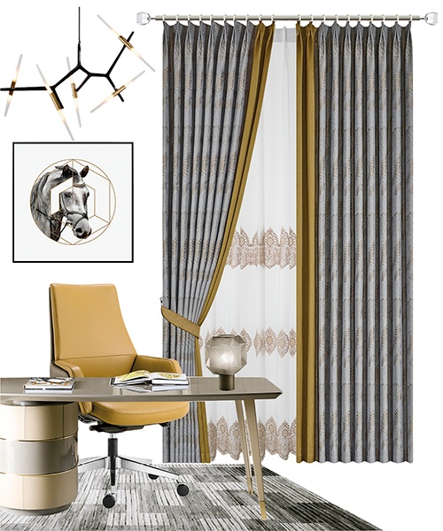 沉靜內(nèi)斂的高級灰搭配一抹時髦姜黃色,完美結(jié)合彰顯優(yōu)雅摩登的撩人誘惑。簾頭波形輪廓優(yōu)雅大氣,為空間平添一份婀娜情韻,成就—種休閑式浪漫。